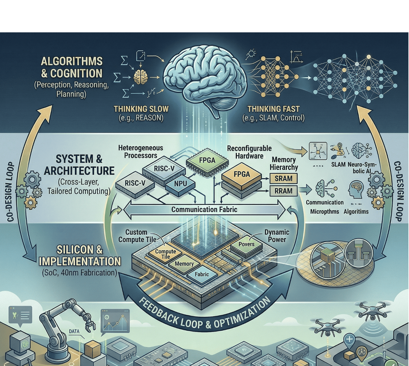 on (1) cross-layer system-architecture-silicon co-design for embodied and physical AI, and (2)